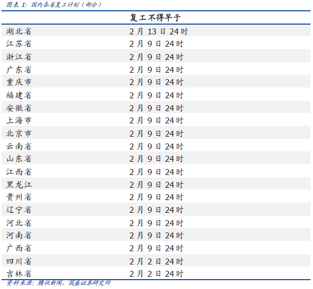 受新型冠狀病毒影響,各省復(fù)工時(shí)間延后。2020年春節(jié)前夕,國(guó)內(nèi)爆發(fā)新型冠狀病毒肺炎疫情,由于本次疫情傳染性較強(qiáng),各省市落實(shí)突發(fā)公共衛(wèi)生事件響應(yīng),延后城市復(fù)工時(shí)間,以防止新型冠狀病毒傳染的疫情擴(kuò)散和蔓延。部分省市將復(fù)工時(shí)間延遲到2020年2月9日24時(shí)之后復(fù)工,較原定計(jì)劃復(fù)工時(shí)間延后一周左右。